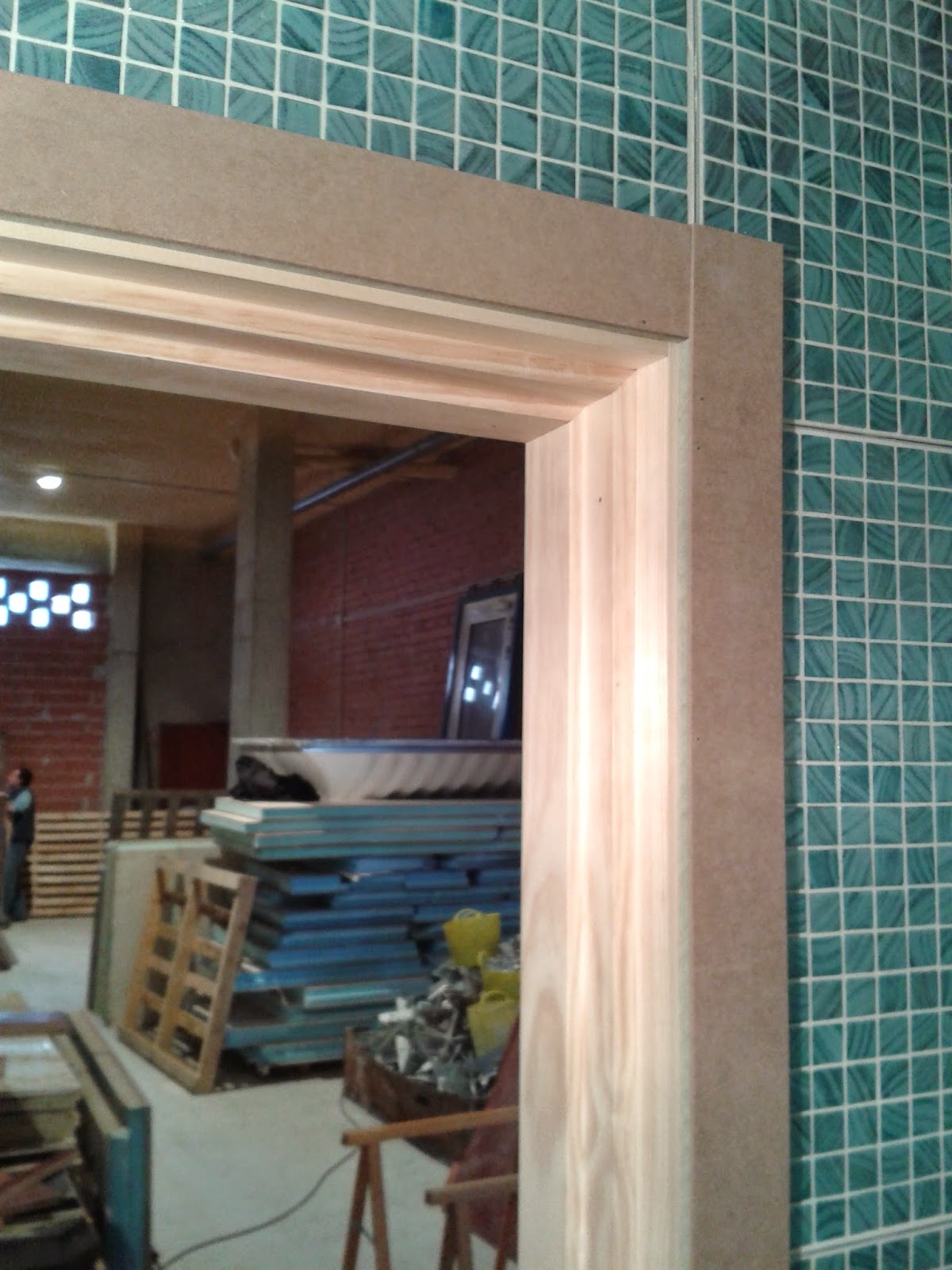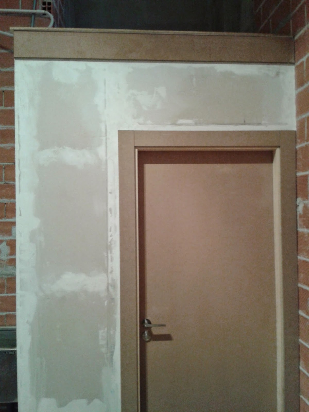 Antes de colocar las jambas, colocamos un listón para coger el nivel de la pared interior del baño.La unión de la jamba la hacemos con corte recto.